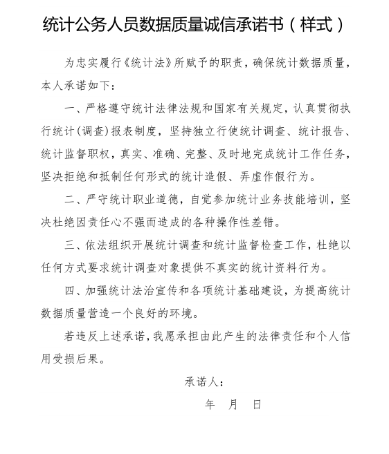 统计公务人员数据质量诚信承诺书
